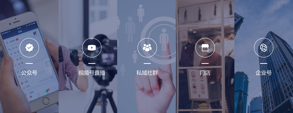 在微信生态互联互动的基础上,企业可根据自身情况搭建场景,公众号、视频号直播、私域社群、门店、企业号等自有组合,做到真正的量身打造式运营。